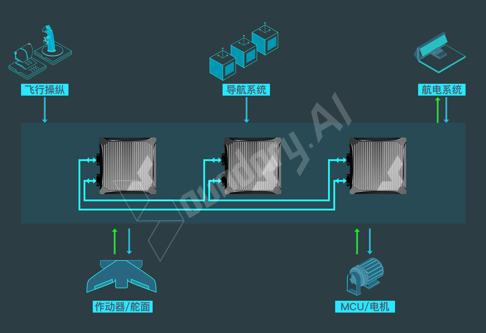 以下为典型高安全飞控系统应用的架构示意图,通过对REG300飞控计算机的合理接口设计和灵活配置,满足不同eVTOL飞机顶层设计需求: