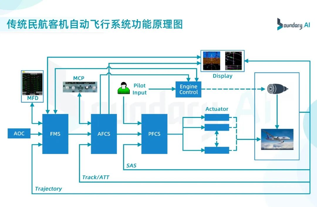 自动飞行控制系统一般包括自动驾驶仪(AP)、飞行指引(FD)和自动油门(A/THR),在三者的联合工作下可实现对飞机的速度、高度、姿态和航向、航迹的控制。