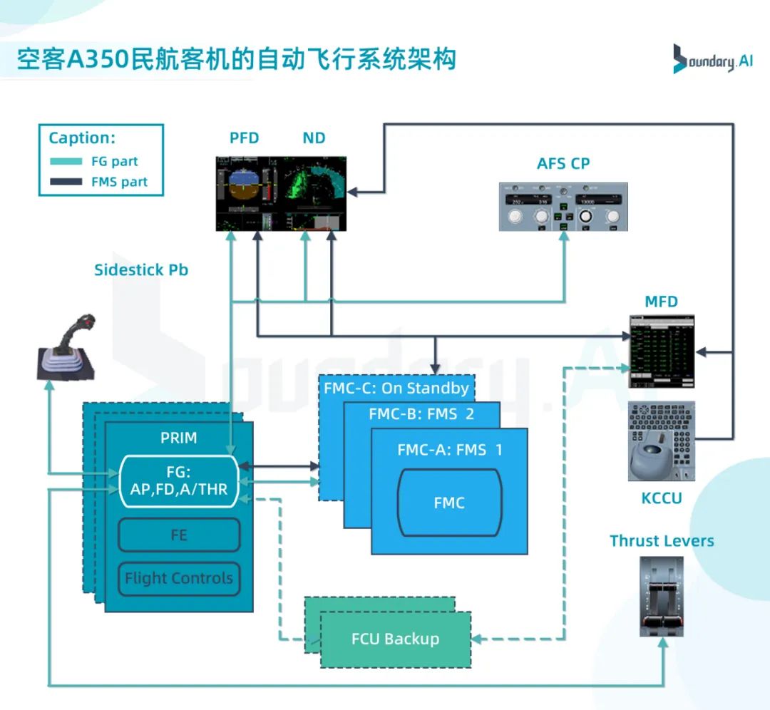 A350的自动飞行系统由3个主飞行控制和引导计算机(PRIMs)和3个飞行管理计算机(FMCs)组成,其中PRIMs包括自动驾驶仪、飞行指引和自动油门。空客对自动飞行系统的子系统划分与波音不尽相同,但其功能原理是一致的,实施过程也是接近的。
