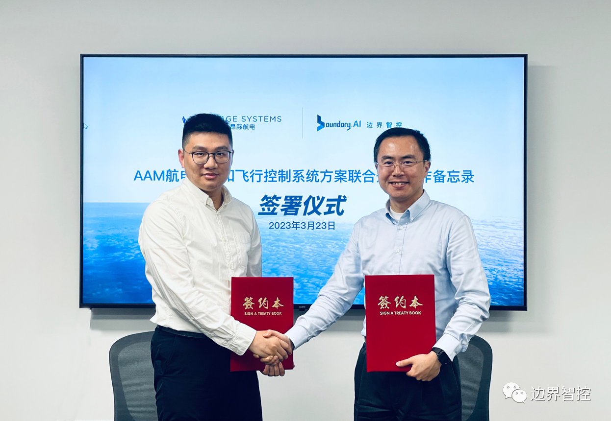 2023年3月23日,边界智控与昂际航电在深圳市签署了《AAM航电套件和飞行控制系统方案联合开发合作备忘录》。双方有意针对AAM市场联合开发面向适航、高安全性、高性价比航电套件和飞控系统解决方案,为主机厂赋能,助力eVTOL机型快速起飞并实现商业化应用。
