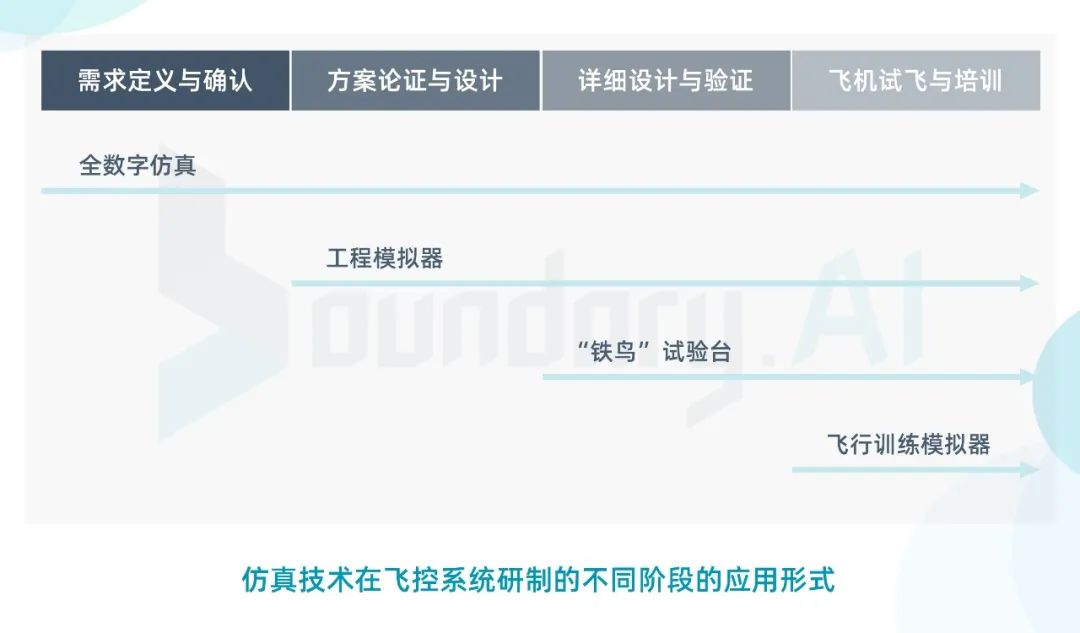仿真形式表现为全数字仿真环境、工程模拟器、“铁鸟”综合试验台和飞行训练模拟器,主要工作包括进行试飞问题复现,完善系统软硬件设计,完善控制律结构参数,协助完成试飞员培训。
