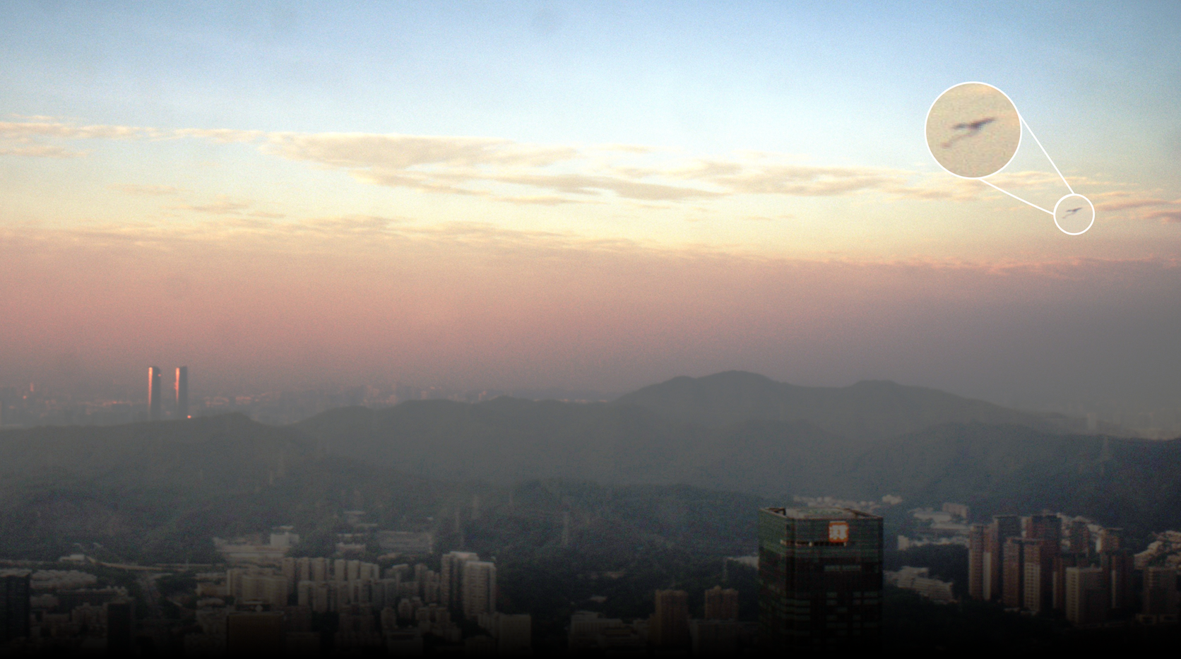 搭载在东部通航直升机上的DAA设备在深圳福田中心区上空拍摄的图像,图右上方出现一个非配合目标