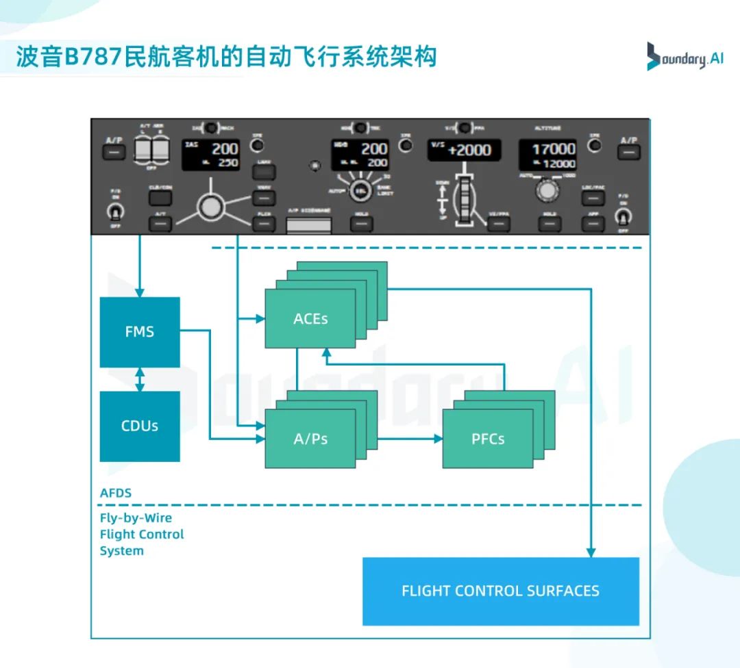B787的自动飞行系统包括飞行管理系统、模式控制面板(MCP)、自动驾驶指引系统(AFDS)和自动油门系统,其中AFDS包括自动驾驶仪和飞行指引,AFDS通过电传飞控系统(FBW)控制各操纵舵面。